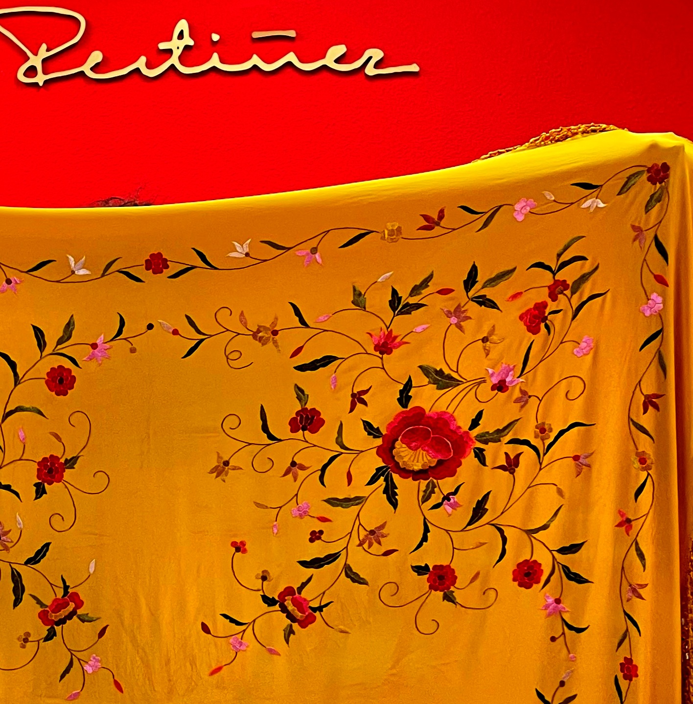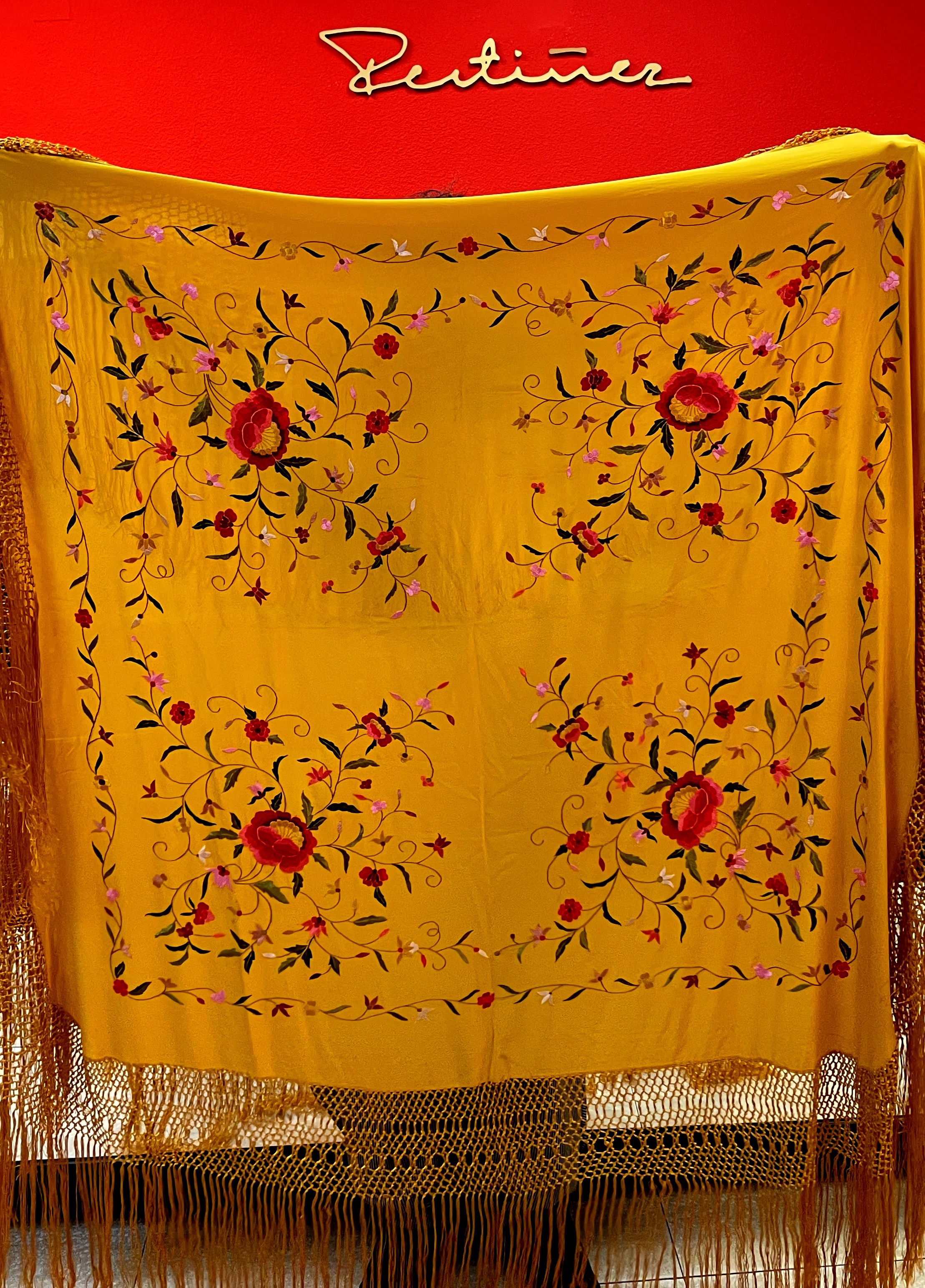 ESPECTACULAR MANTON FONDO MOSTAZA BORDADO A MANO COLORES EN 140X140 , GRAN FLECO HECHO A MANO ,BUEN PESO CASI 850 GRAMOS, MUY VISTOSO EN ESCENARIO , RECOMENDABLE PARA BAILE O VESTIDO DE MADRILEÑA.EN STOCK ENVIO SOLO A PENINSULA. PARA ENVIOS AL EXTARNAJERO O CANARIAS CONTACTAR POR NUESTRO WASAP