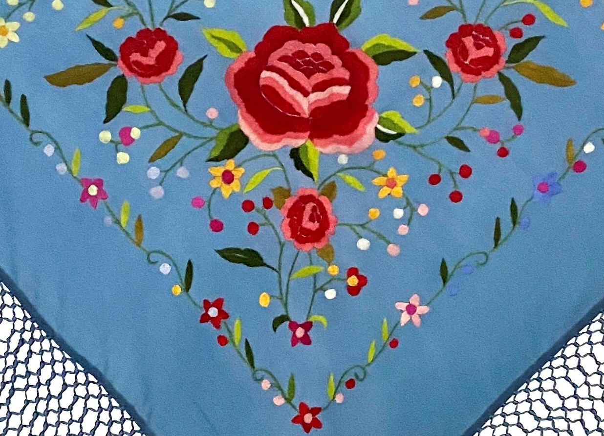 MANTON PICO DE SEDA NATURAL BORDADO A MANO, FLECO A MANO. PERFECTO PARA FLAMENCO, Y TAMBIEN COMO COMPLEMENTO PARA BODAS Y EVENTOS. TAMAÑO APROXIMADO 165X80.AZUL BORDADO COLORES